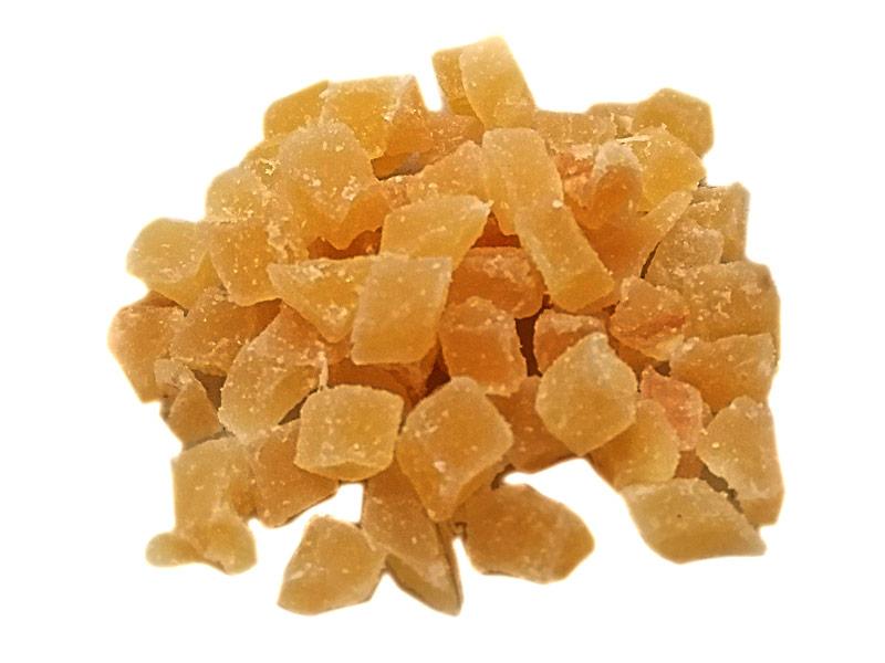 Zenzero candito dolce, utilizzabile per aromatizzare dolcemente tè o tisane, oppure anche per essere gustato come snack.
